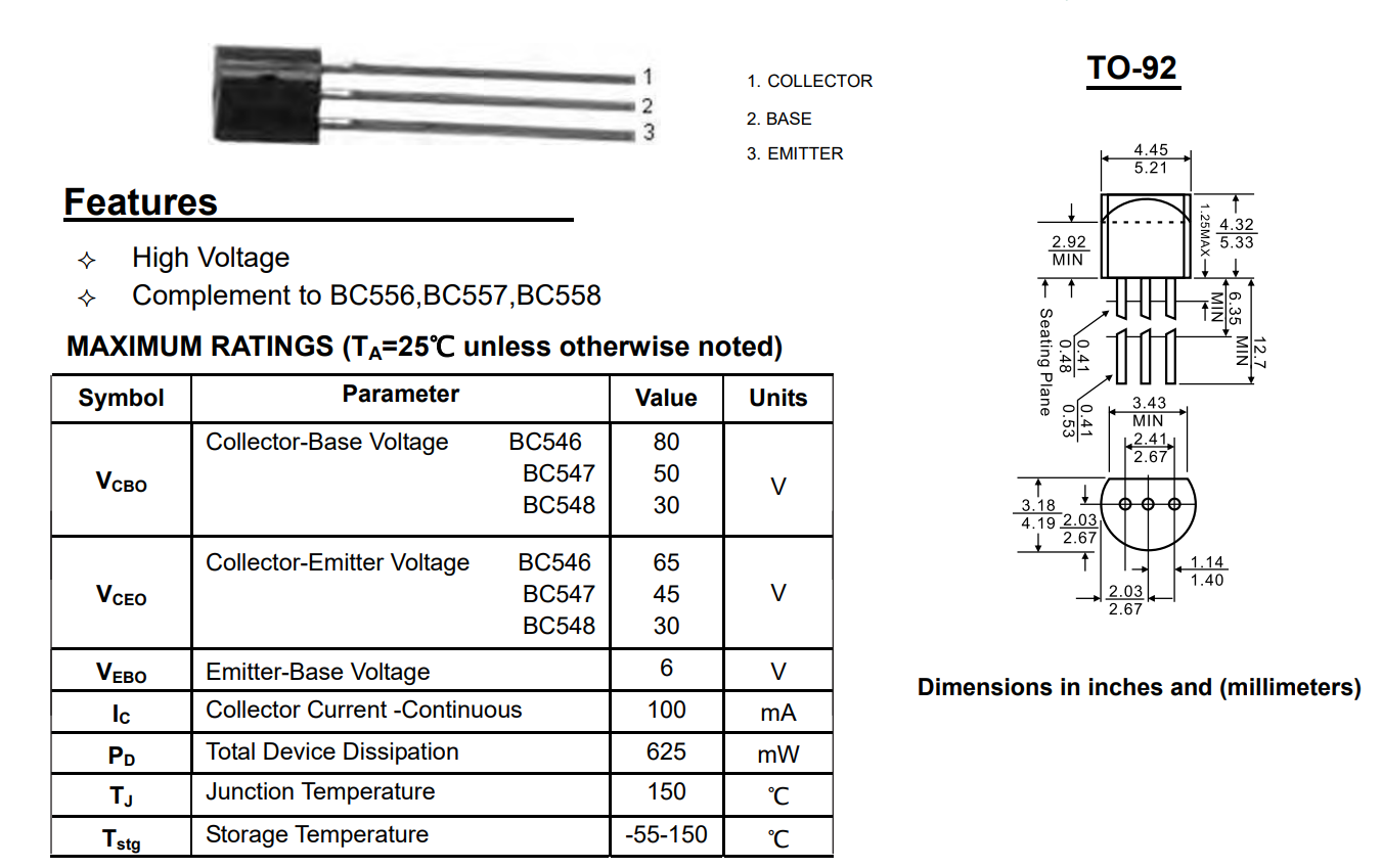 BC547C Bipolar (BJT) Transistor NPN 45V 100mA 150MHz 625mW Through Hole TO-92